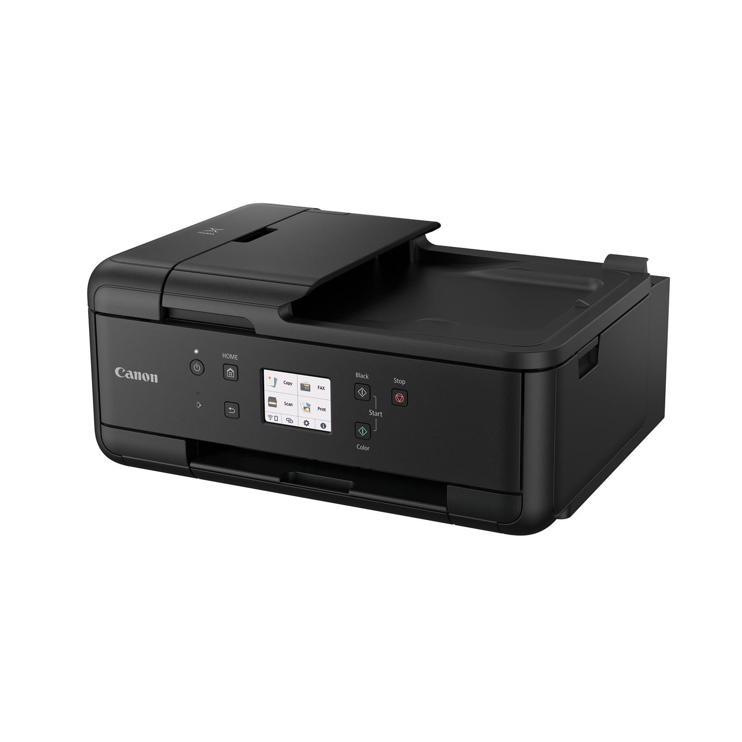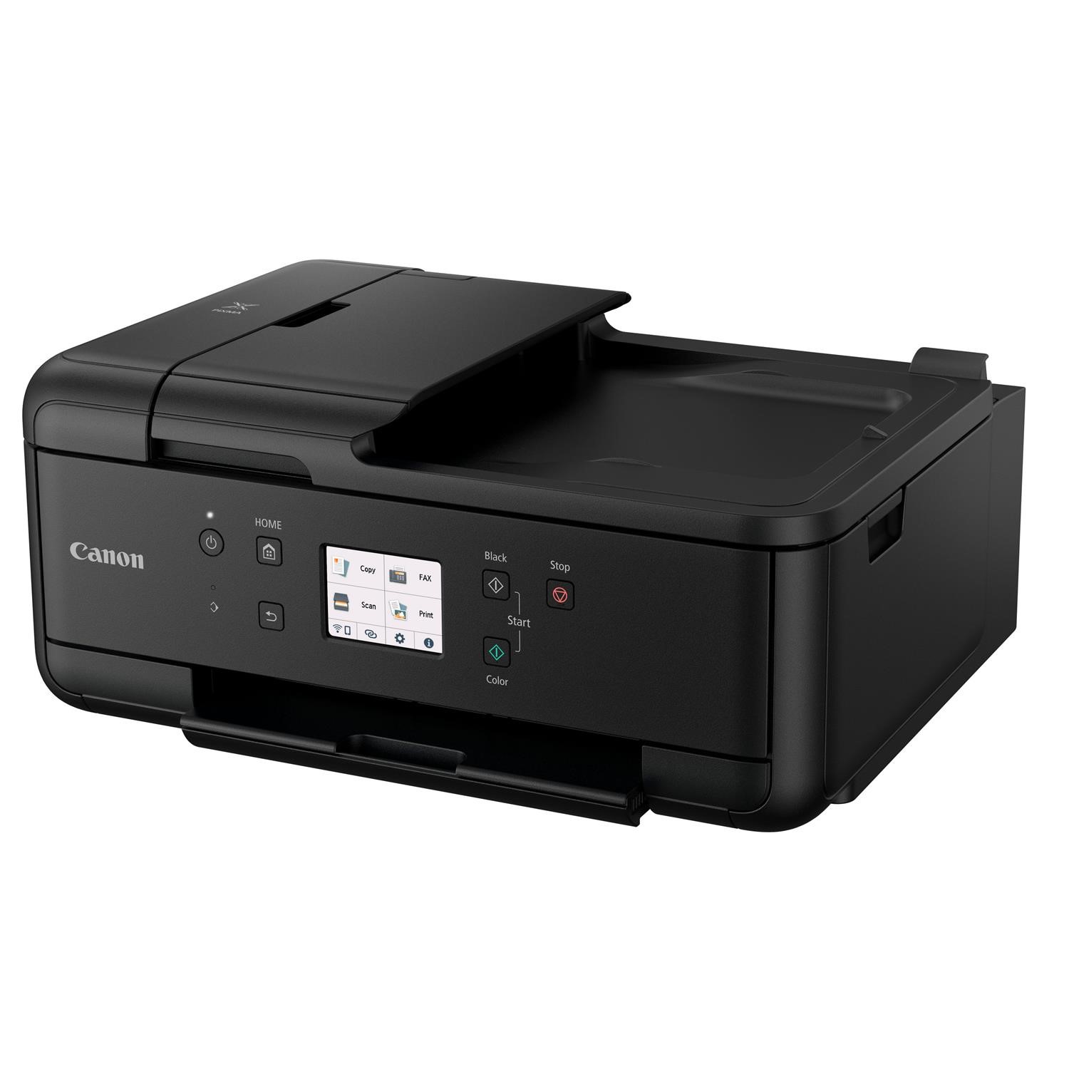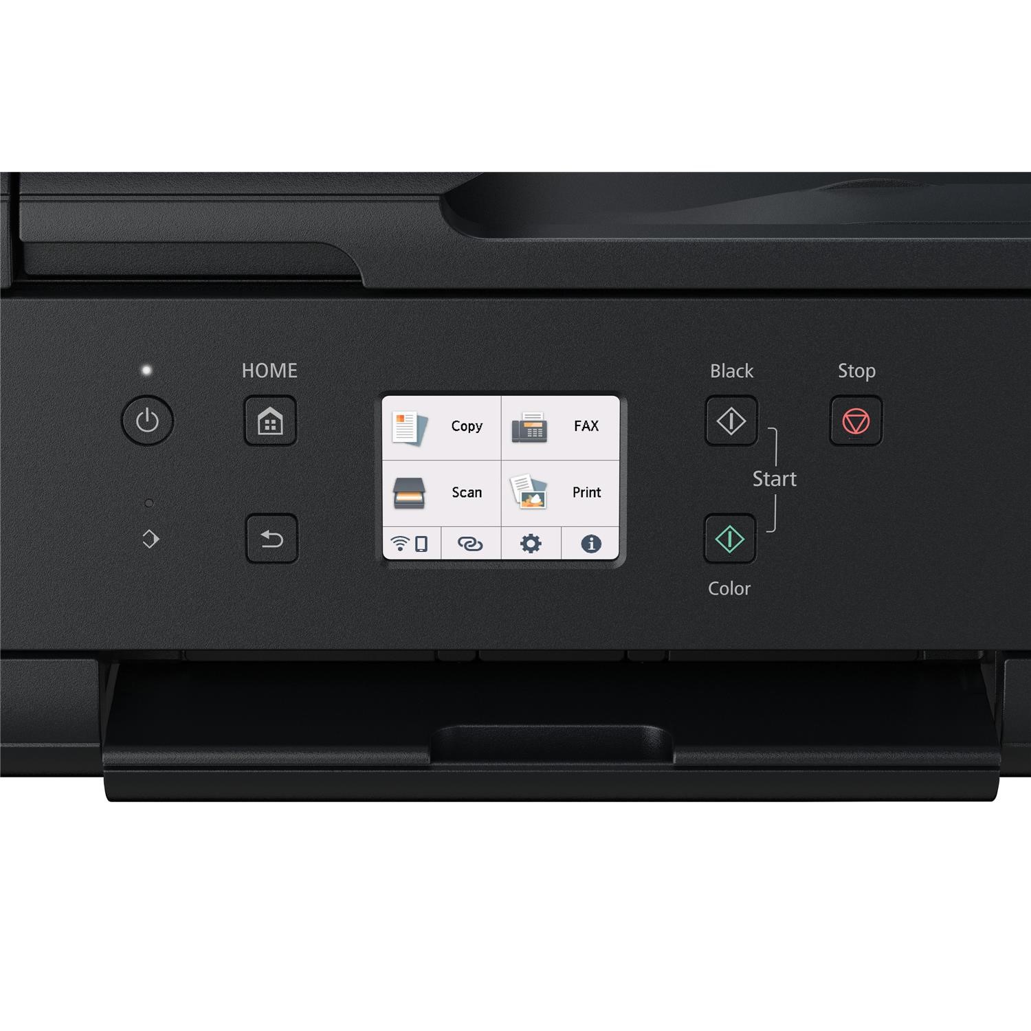 Print, copy, scan and fax using a single compact device with this inkjet multifunction printer. Ideal for small and home office printing, it offers flexible Wi-Fi connectivity, wireless direct printing from mobile devices, and cloud printing and scanning via the Canon PRINT app using Cloud Link. The 5 individual ink photo and document printer creates rich, vibrant and detailed borderless colour photos up to A4 size and pin-sharp text documents that are crisp and easy to read. The 20-sheet ADF and front and rear paper feeding ensures excellent productivity. Make savings with optional XL and XXL ink cartridges and automatic 2-sided printing, all easy to use and set up via a QR code and large 7.5 cm colour touchscreen.<br><br>