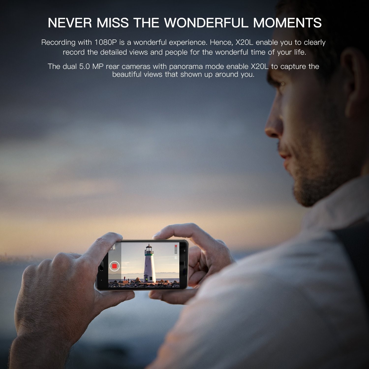 The dual 5.0 MP rear cameras with panorama mode enable X20L to capture the beautiful views around you. Recording with 1080P, you'll never miss the wonderful moments. Hence, X20L enables you to clearly record the detailed views and people for the wonderful time of your life.