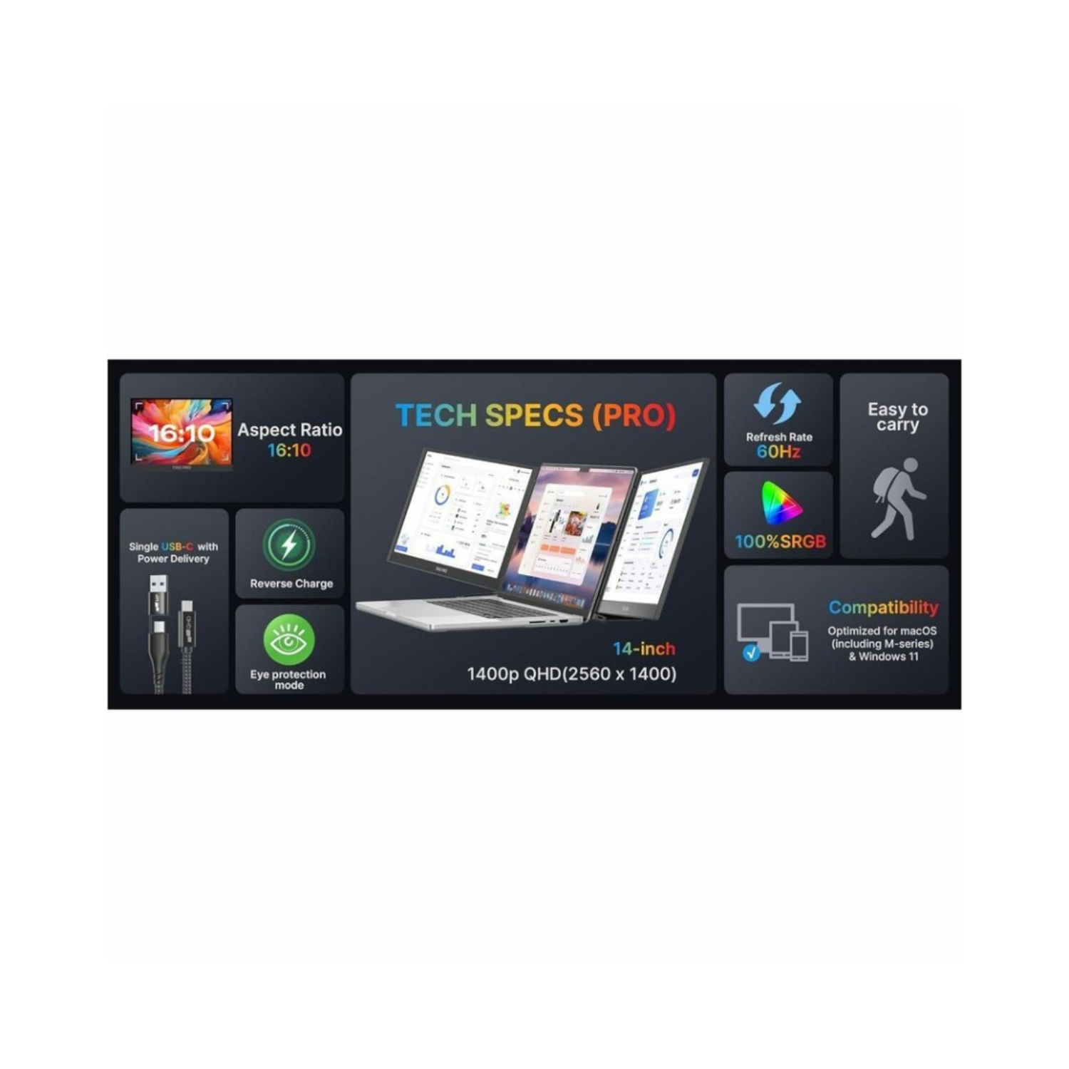 Experience crisp, vibrant visuals on the 14.1-inch IPS QHD screen. With 2560 x 1600 resolution, the monitor delivers sharp details and accurate colors, perfect for creative work, streaming, or multitasking on the go.