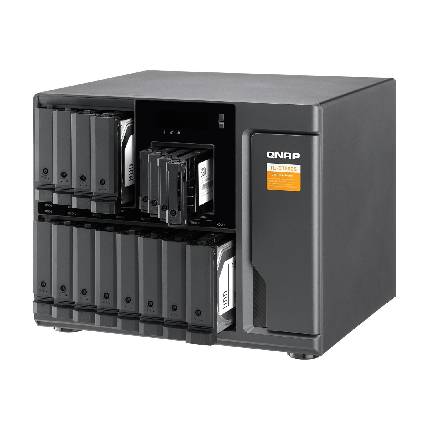 The TL-D1600S JBOD storage enclosure allows you to back up and expand your QNAP NAS, Windows, and Ubuntu computers and servers. The TL-D1600S features twelve 3.5-inch/2.5-inch SATA 6Gb/s drive bays and four 2.5-inch SATA 6Gb/s SSD bays. It provides reliable read/write performance for smooth storage and backup tasks.