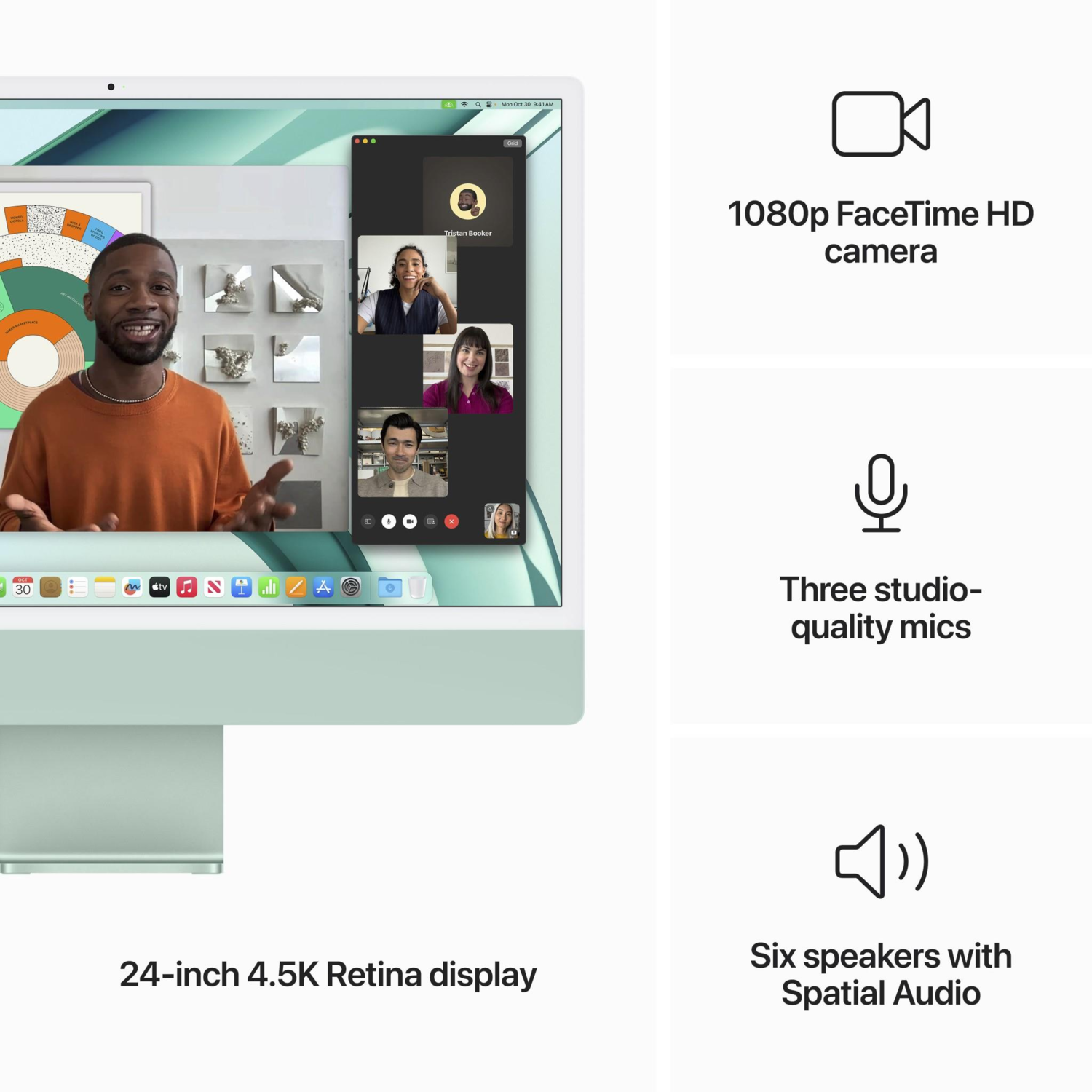 From vibrant green to bold blue, the iMac offers an array of colours to suit your style. Its sleek, ultra-slim 11.5-millimetre all-in-one design, made possible by Apple silicon, is complemented by striking colour-matched wallpapers, making the iMac a stunning addition to any space.