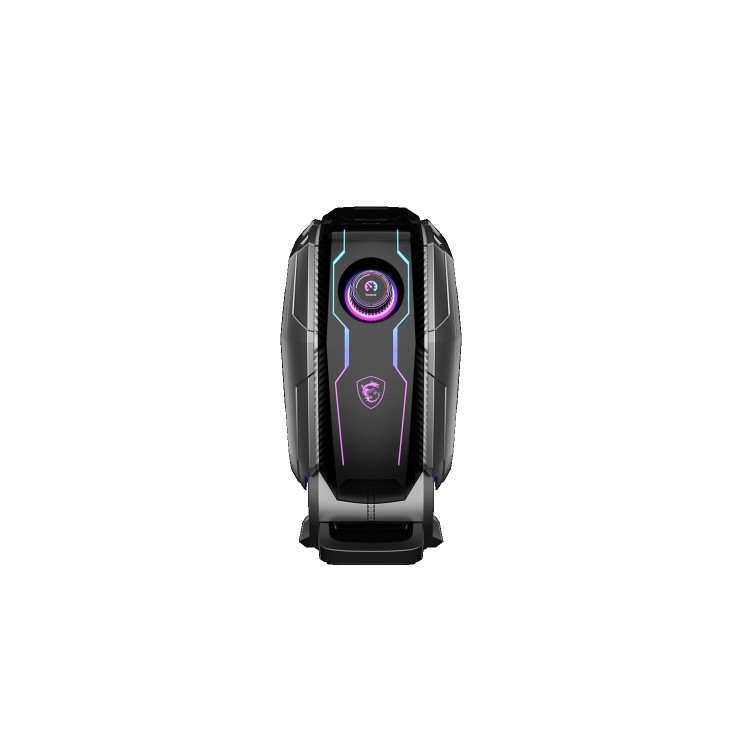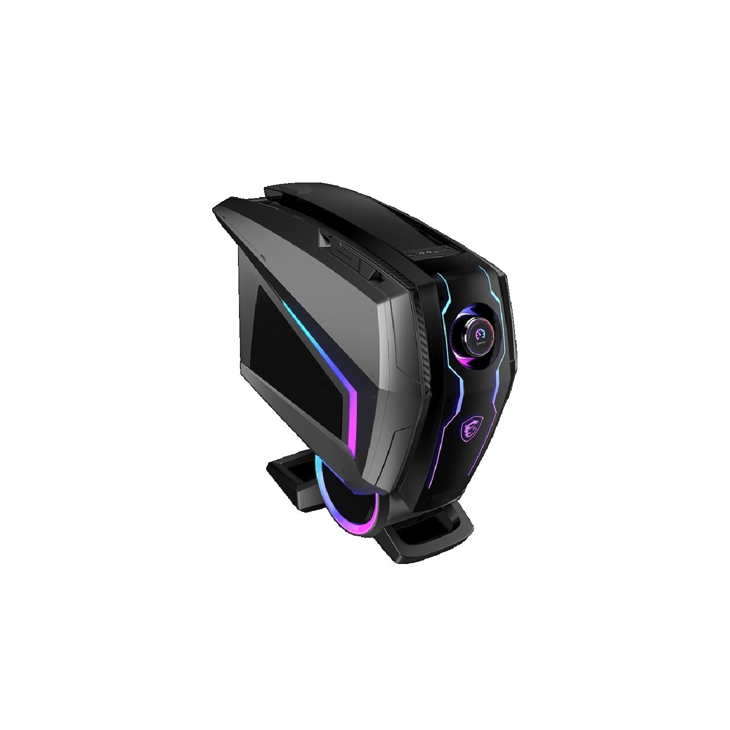 The Aegis has a sleek, futuristic design with a brushed aluminum front panel and RGB lighting. It will look great in any gaming setup.