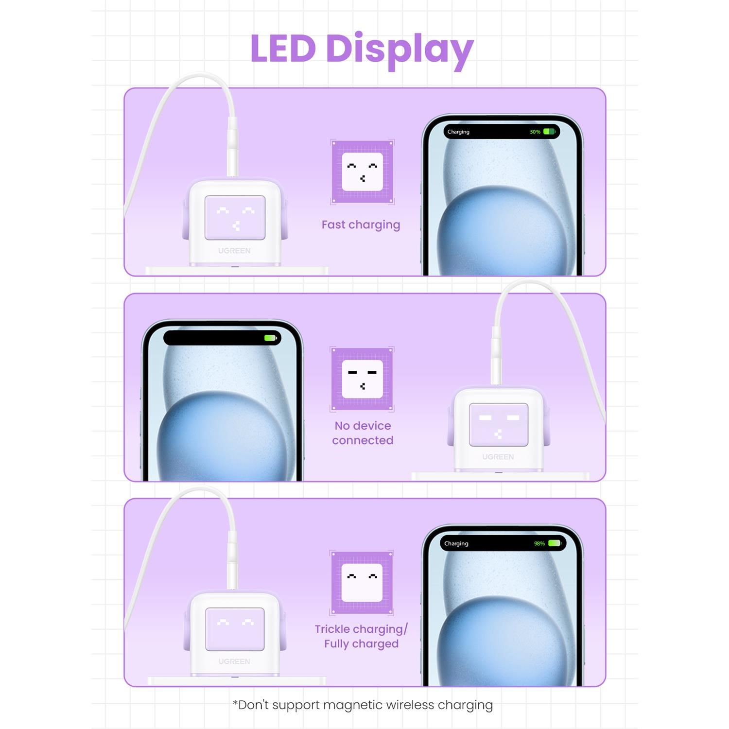Equipped with a smart mini screen, which shows the charging status in real-time when charging is in progress or when it has finished charging, please note that the LED display will only light up when plugged into the power strip