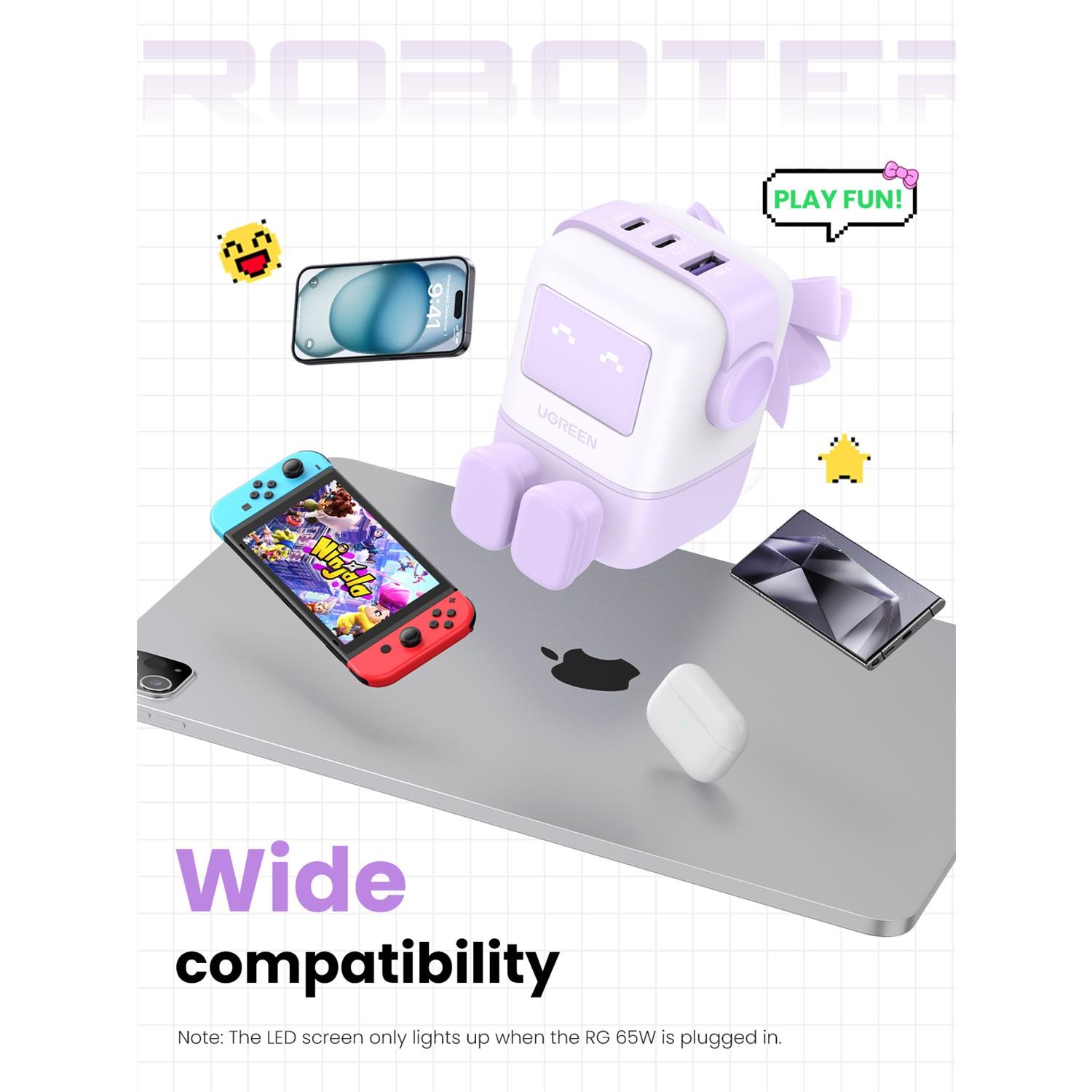 Introducing our futuristic and adorable UGREEN Uno 65W USB C GaN Charger, this UGREEN small robot-shaped charger combines functionality with fun, making it the ideal accessory for all your charging needs on the go.