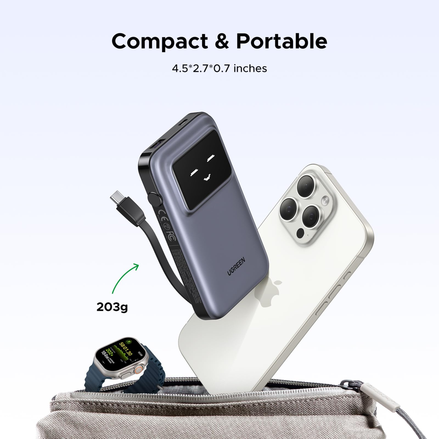Built in a USB C Cable, UGREEN Uno power bank effectively avoids the trouble of carrying extra cable or cable mess, just pick it up and get power.